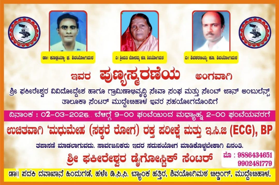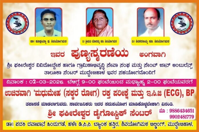 ಮುದ್ದೇಬಿಹಾಳ: ಪಟ್ಟಣದ ಪುರಸಭೆ ಹತ್ತಿರ ಬಸ್ ನಿಲ್ದಾಣ ಕಂಪೌಂಡಗೆ ಹೊಂದಿಕೊಂಡು ಇರುವ ಶ್ರೀ ಫಕಿರೇಶ್ವರ ಡೈಗ್ನೋಸ್ಟಿಕ್ಸ್ ಸೆಂಟರನ ಶಿವಯೋಗಿಮಠ ಬಿಲ್ಡಿಂಗನಲ್ಲಿ ಮಾ.2 ರಂದು ಬೆಳಿಗ್ಗೆ 8 ರಿಂದ ಮದ್ಯಾಹ್ನ 2 ಘಂಟೆಯವರೆಗೆ ದಿವಂಗತರಾದ ಡಾ|ಕೂಡ್ಲಯ್ಯ ಘಟವಾಳಯ್ಯ ಶಿವಯೋಗಿಮಠ, ಬೋರಮ್ಮ ಕೂಡ್ಲಯ್ಯ ಶಿವಯೋಗಿಮಠ, ಶಿವಶರಣಯ್ಯ ಕೂಡ್ಲಯ್ಯ ಶಿವಯೋಗಿಮಠ ಅವರ ಸ್ಮರಣಾರ್ಥ ಆರೋಗ್ಯ ಉಚಿತ ತಪಾಸಣಾ ಶಿಬಿರ ಏರ್ಪಡಿಸಲಾಗಿದೆ. ಶಿಬಿರದಲ್ಲಿ ಮಧುಮೇಹ ರಕ್ತ ತಪಾಸಣೆ, ಹೃದಯ ಸಂಬಂಧಿತ ಇಸಿಜಿ, ಬಿಪಿ ರಕ್ತದ ಒತ್ತಡ ತಪಾಸಣೆ ನಡೆಸಿ ಸೂಕ್ತ ಚಿಕಿತ್ಸೆ ನೀಡಲಾಗುತ್ತದೆ. ಆಸಕ್ತರು ಶಿಬಿರದ ಸದುಪಯೋಗ ಪಡೆದುಕೊಳ್ಳಬೇಕು ಎಂದು ಶಿಬಿರ ಆಯೋಜಕರಾದ ಡಾ|ಸಿ.ಕೆ.ಶಿವಯೋಗಿಮಠ, ಶಾಂತಯ್ಯ ಶಿವಯೋಗಿಮಠ ಪ್ರಕಟಣೆಯಲ್ಲಿ ತಿಳಿಸಿದ್ದಾರೆ. ಹೆಚ್ಚಿನ ಮಾಹಿತಿಗೆ ಮೋ: 9886434651, 99024 81779 ಸಂಪರ್ಕಿಸಬಹುದು.