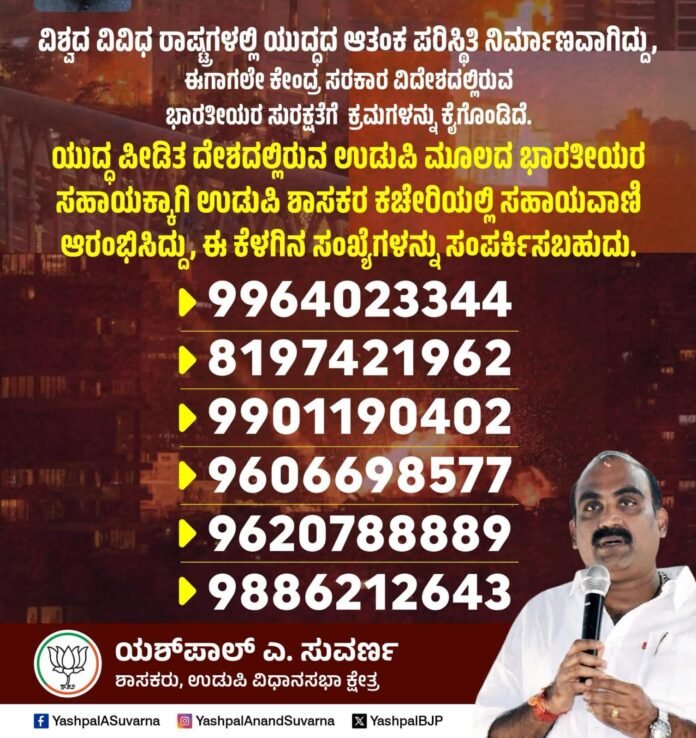 ಯುದ್ಧ ಪೀಡಿತ ದೇಶಗಳಲ್ಲಿರುವ ಉಡುಪಿಯವರ ನೆರವಿಗೆ ಶಾಸಕ ಯಶ್ಪಾಲ್ ಸುವರ್ಣ ಅವರಿಂದ ಸಹಾಯವಾಣಿ ಆರಂಭ
